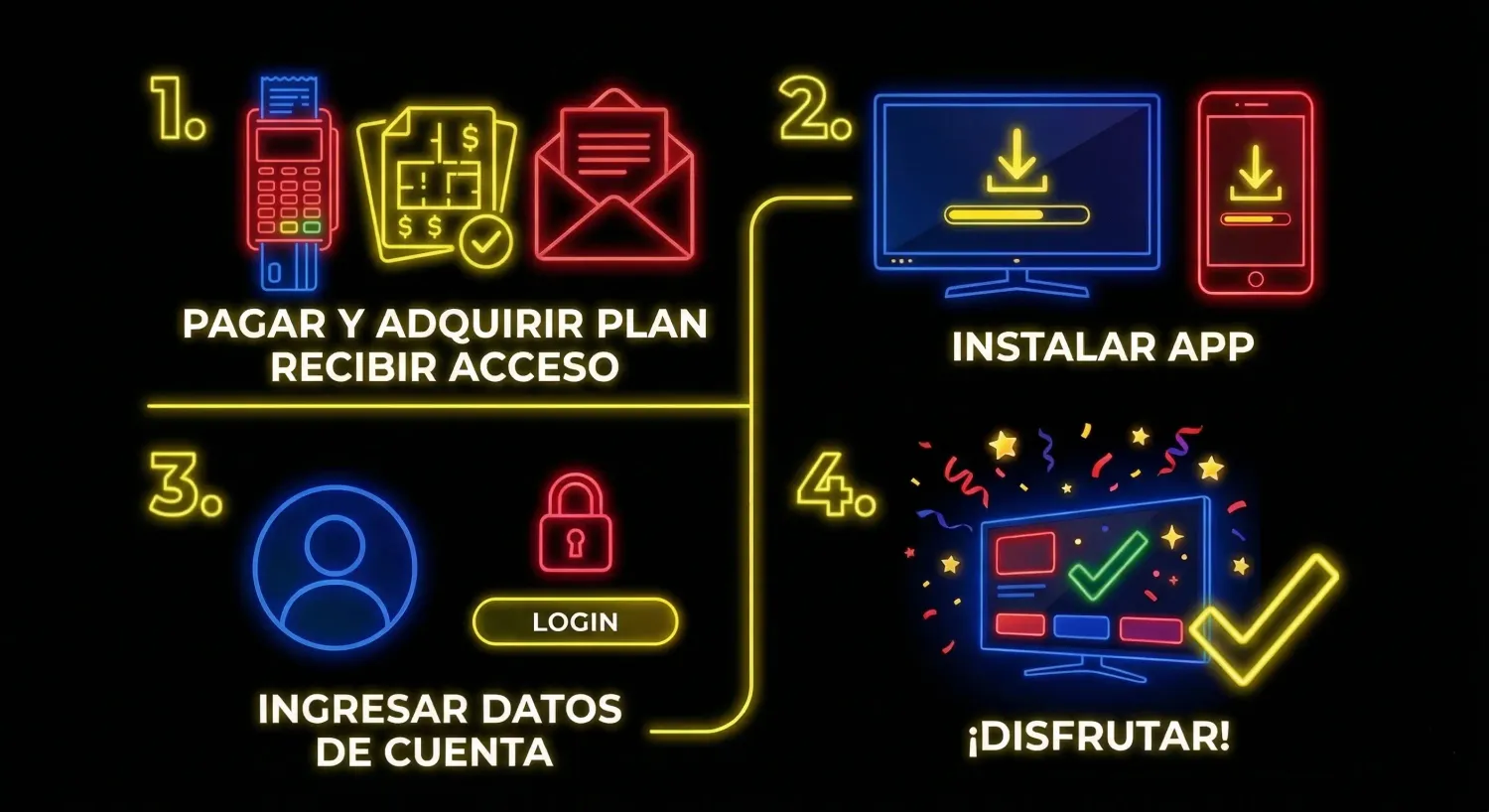 Funciona con un plan que el usuario adquiere, recibiendo una cuenta de usuario que ingresará a una App, que puede ser gratuita o de licencia paga, según los dispositivos en los que usarás el servicio (TV, Celular, Tableta, etc.).